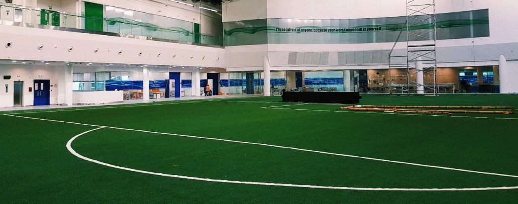 Gibca successfully completed the project creating a curved partition as visualized by the client and consultant. The offices, meeting, and conference rooms overlook the indoor training fields creating a fully functional space. The design team incorporated the vibrant brand colors of the company to create a signature look for the overall architecture. The company’s positive and confidence-boosting slogans were also combined within the office partition design. The end result was a space created for multi-functionality allowing for smooth workflow transition while maintaining the desired level of acoustic privacy.