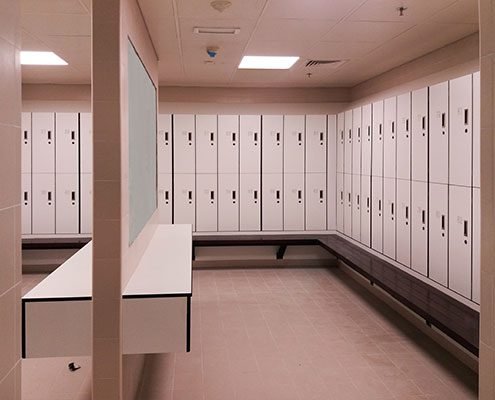 Gibca had the exciting opportunity to be part of this project and successfully designed and delivered different product lines including full locker system with benches, washroom cubicles, shoe rack cabinets and vanity countertops. For all the products, the key requirement was highly durable surface material that would endure the high traffic use while aesthetically fitting in with the elegant architectural design.