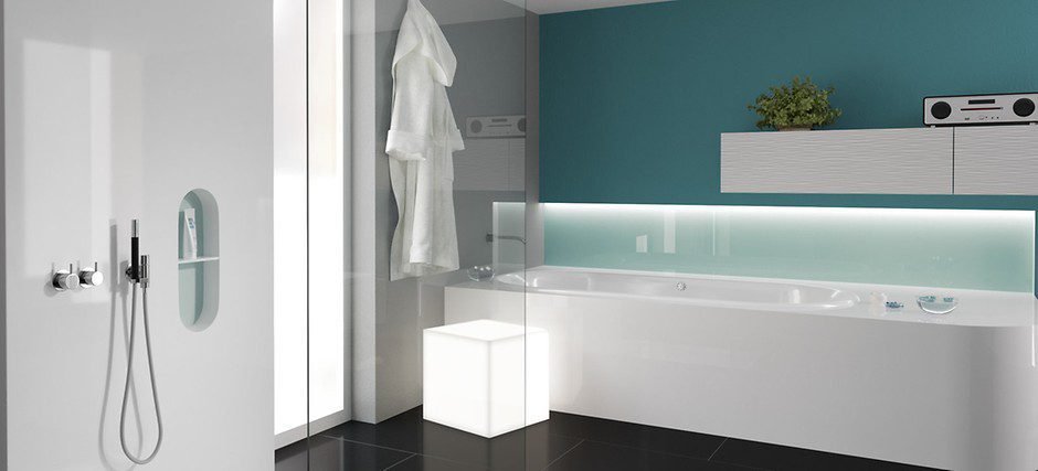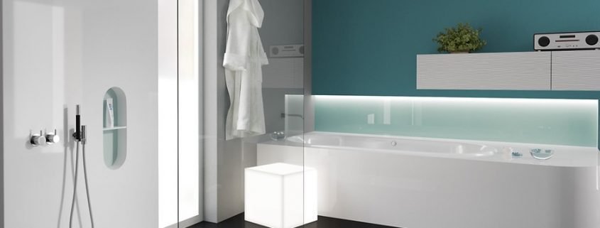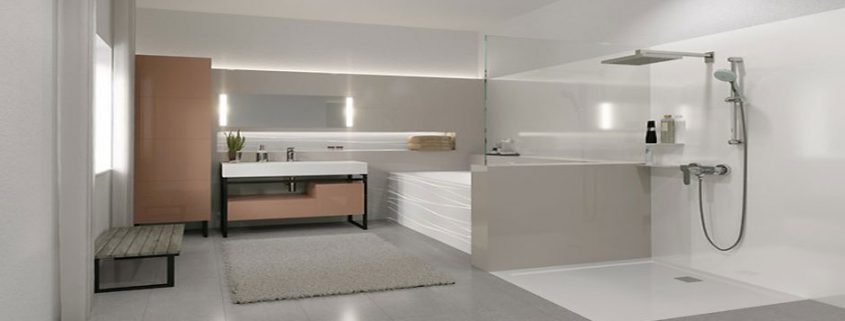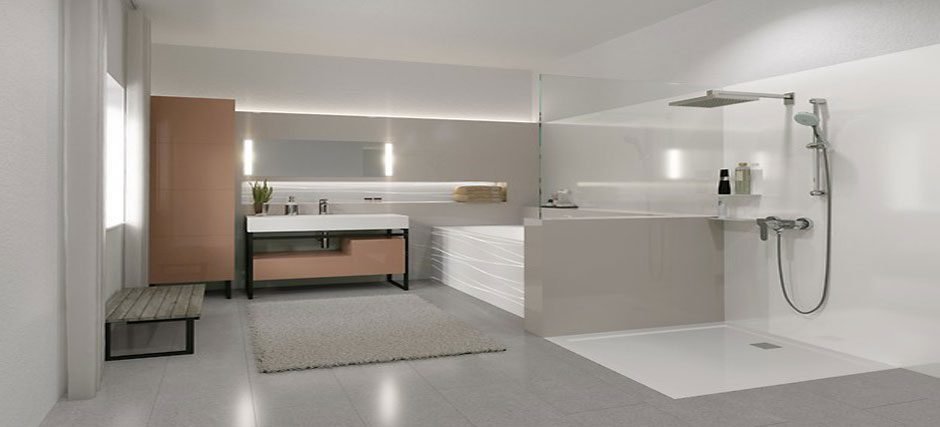 Homeowners use the same material across several different applications within their bathrooms to create a sense of design unison and cohesiveness. Choose RAUVISIO Crystal for your shower wall panel, your cabinet door front and your bathroom worktops for a superior design solution that will withstand the test of time.