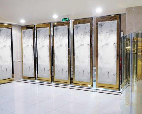 The crystal and gloss finish gives the interior design of ballrooms, convention centers, corporate offices and other hospitality spaces an extravagant richness. Wall panels also experience normal wear and tear – the innovative Rauvisio surface materials combine functionality with extreme durability and countless design options.
